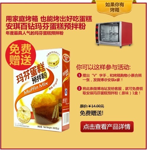 安琪酵母免费宝贝之一:百钻玛芬蛋糕预拌粉。家用烤箱用户,安琪专门准备了最适合家庭烤箱使用的安琪百钻玛芬蛋糕预拌粉(原味),作为活动礼物送给大家。只需要加鸡蛋、牛奶、食用油这些液体材料,和玛芬蛋糕预拌粉充分搅拌,再进烤箱烘烤15分钟左右,就能轻松烤出好吃蛋糕!这款产品可是年度最具人气的蛋糕预拌粉哟。