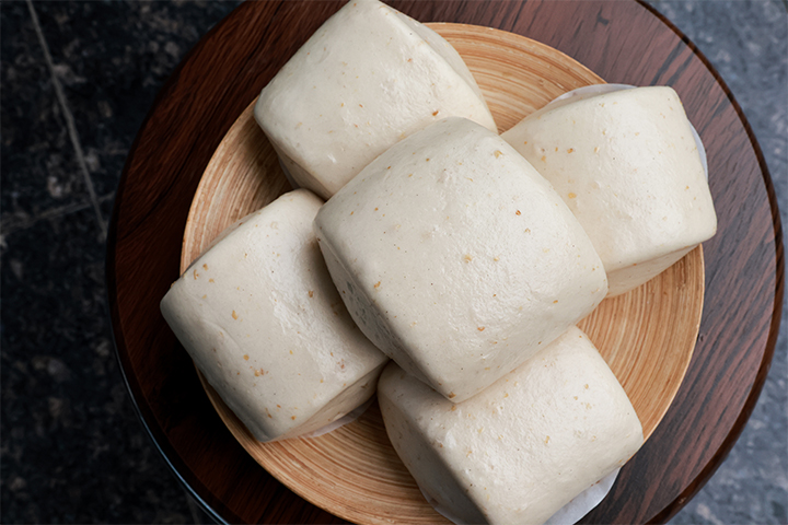 3.成型。将和好的面团放入压面机压至光滑的面片,卷成长条状,下剂100克/个,将下好的剂子揉圆做成圆馒头,也可搓条以后刀切成方馒头。