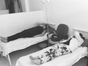 在盘锦市水木清华社区诊所,46岁的李素珍和家人躺在病床上正在输液,她们一家因为吃自助餐,相继出现呕吐、腹泻等症状。 记者 徐刚 摄