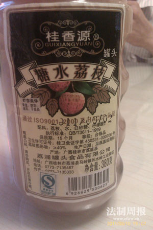"明明是2009年生产的水果罐头,硬是贴上了2011年的生产标签……",方先生表示,他购买的这瓶"桂香源"糖水荔枝罐头颜色发黄,罐头水浑浊,看上去并不新鲜,但其标签上的生产日期为2011年6月2日,还标明了生产厂家、卫生许可证号、食品质量安全标志,因此当时也没有多想。(法制周报新闻热线:0731-84802117)罐头标注的保质期是15个月,即这瓶罐头早在2010年10月就已经过期。"商家居然将这些过期产品重新贴上新的生产标签就继续摆在超市里卖。"方先生说。