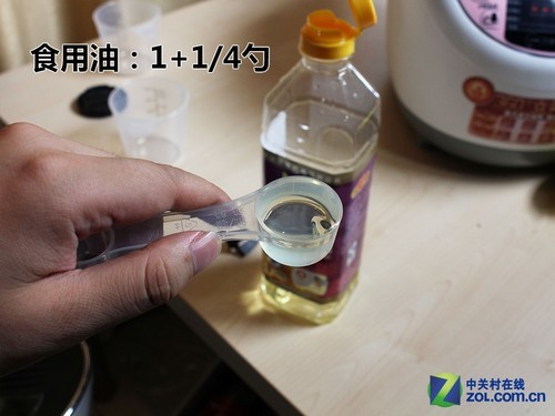 包装纸随机器送了两个量杯和一个勺子,并标有刻度。在制作时,只需按照需求配比将面、水、油等材料盛装好,倒入锅内即可。