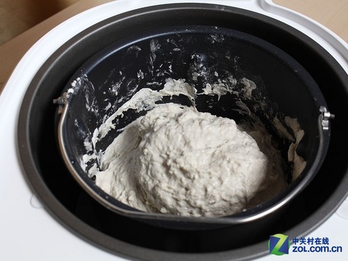 将材料全部倒入后,馒头机会自动完成和面步骤。强力点击带动内胆的桨叶,粘稠的面粉随之起舞,从开始的烟尘四散没过多久,便成为一坨呃···面团。搅拌的节奏铿锵有力,时断时续,时而奋力时而轻巧,可谓技巧高明。
