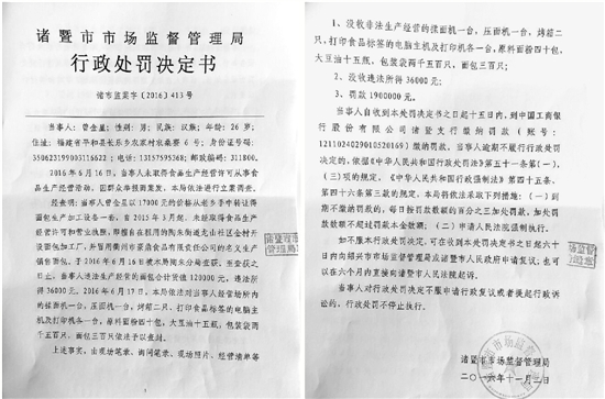 “目前,这个处罚决定还属于公告阶段,并未真正生效。”执法人员介绍,自从曾某逃走以后,该局便将《拟处罚告知书》邮寄送到其户籍所在地,但是被邮政部门退回,所以只好公告送达。目前,诸暨市市场监管局将处罚信息公告发布在诸暨市政府信息公开网上,公告60天之后,这份《处罚决定书》才会生效。